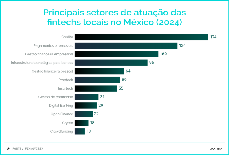O ecossistema fintech mexicano é liderado pelo segmento de crédito digital (lending), que reúne 174 empresas. Em seguida, aparecem as soluções de pagamentos e remessas, com 134 fintechs, impulsionadas pelo crescimento do comércio eletrônico e da digitalização dos pagamentos no país.
