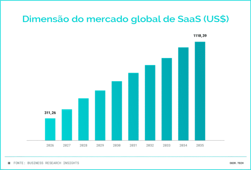 A consolidação do SaaS como modelo dominante de entrega de software pode ser observada, primeiro, em uma perspectiva macro. De acordo com um estudo da Business Research Insights, o mercado global de SaaS iniciou 2026 avaliado em US$ 311,26 bilhões e manterá uma trajetória acelerada de crescimento até alcançar aproximadamente US$ 1.110,39 bilhões em 2035.